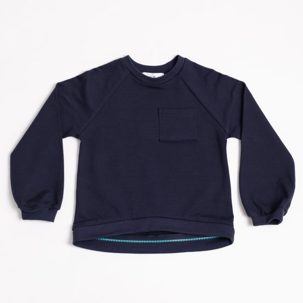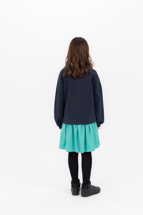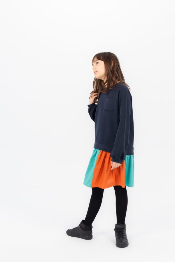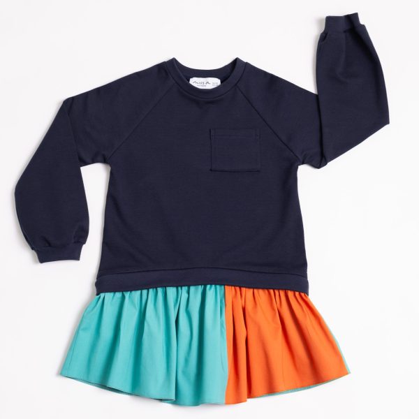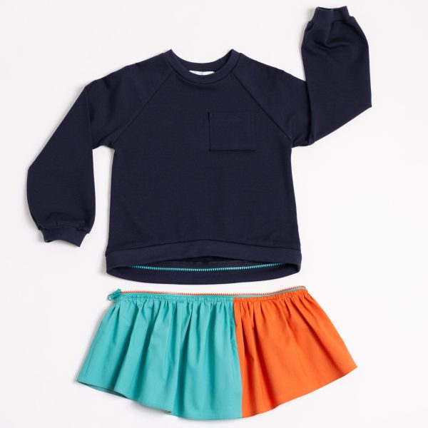 Hanoracul cu buzunar aplicat este dintr-un material moale, ușor elastic și super comod. Fusta detașabilă este din bumbac și se remarca prin combinația de culori – bleu prăfuit & portocaliu.